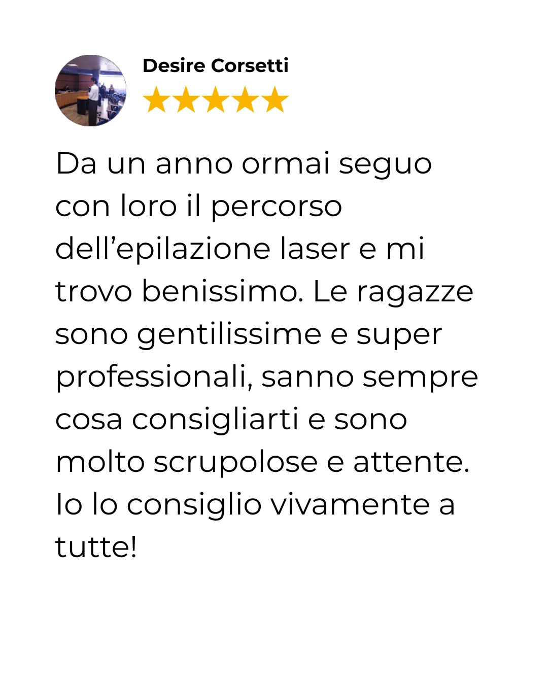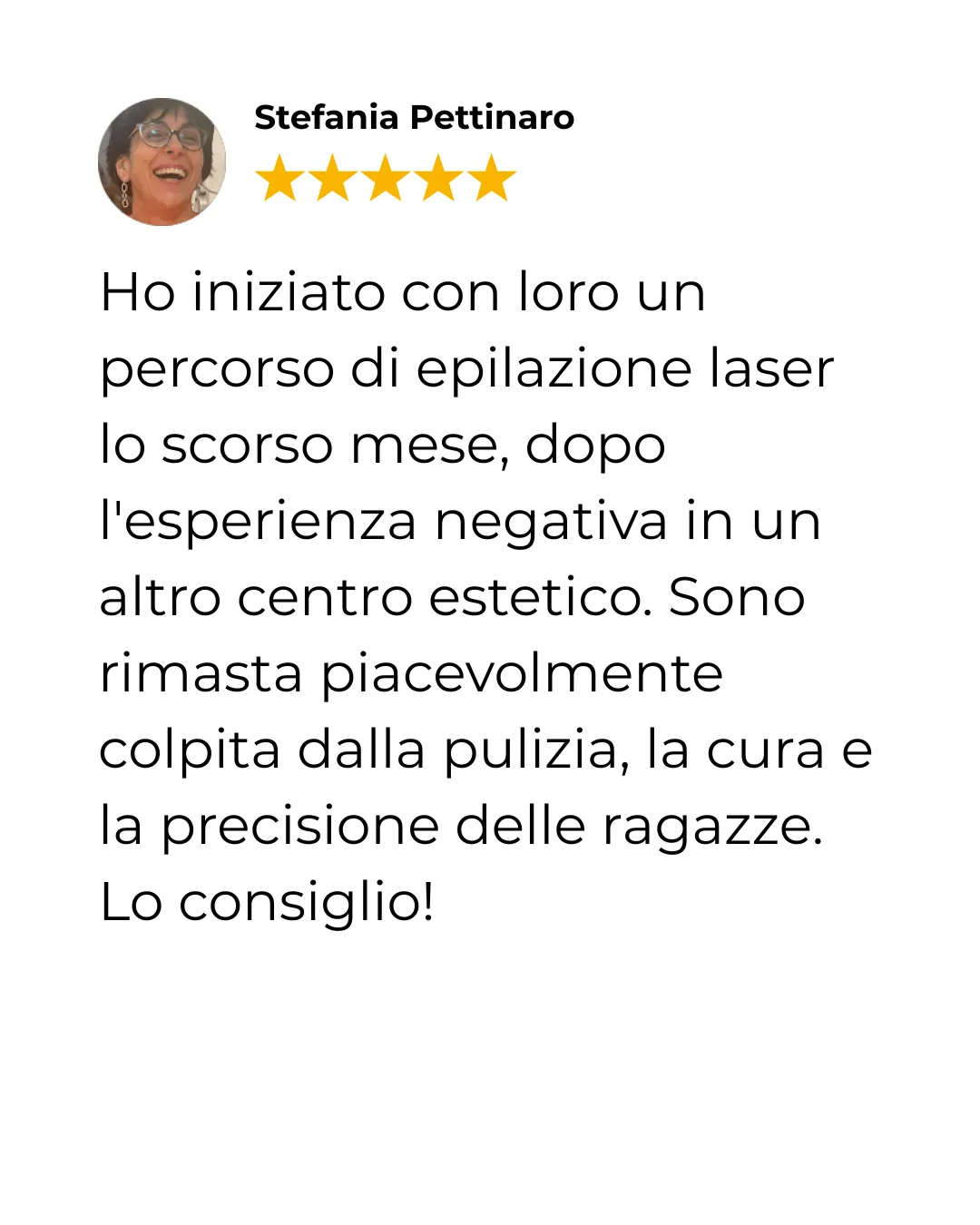 "Già dal secondo mese di trattamento ho iniziato a vedere la crescita del pelo davvero, davvero rallentata. Ho trovato un ambiente super confortevole e sono sempre stata accolta col sorriso, entravo qui e respiravo un'enegia giovanile, positiva e rigenerante. Consiglierei senz'altro questo trattamento"